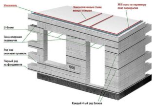 Le moyen le plus simple et le plus rapide à mettre en œuvre est d'utiliser des blocs en forme de U à parois minces. Ils sont collés dans une rangée fermée le long du périmètre jusqu'à l'avant-dernier niveau, traités avec un apprêt et une isolation thermique est placée à l'intérieur. Après cela, il reste à installer les goujons et à continuer à travailler.