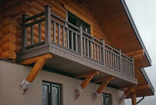 - L'assemblage des supports dépend des souhaits du propriétaire de la maison. Il est permis de faire l'installation d'entretoises en bois triangulaires. Fixez les poutres du balcon au mur du bâtiment avec des ancrages. La base du triangle servira de support supplémentaire. Décorez la structure en bois avec des éléments en métal forgé. Utilisez des matériaux qui se marient harmonieusement avec l'apparence générale du bâtiment.