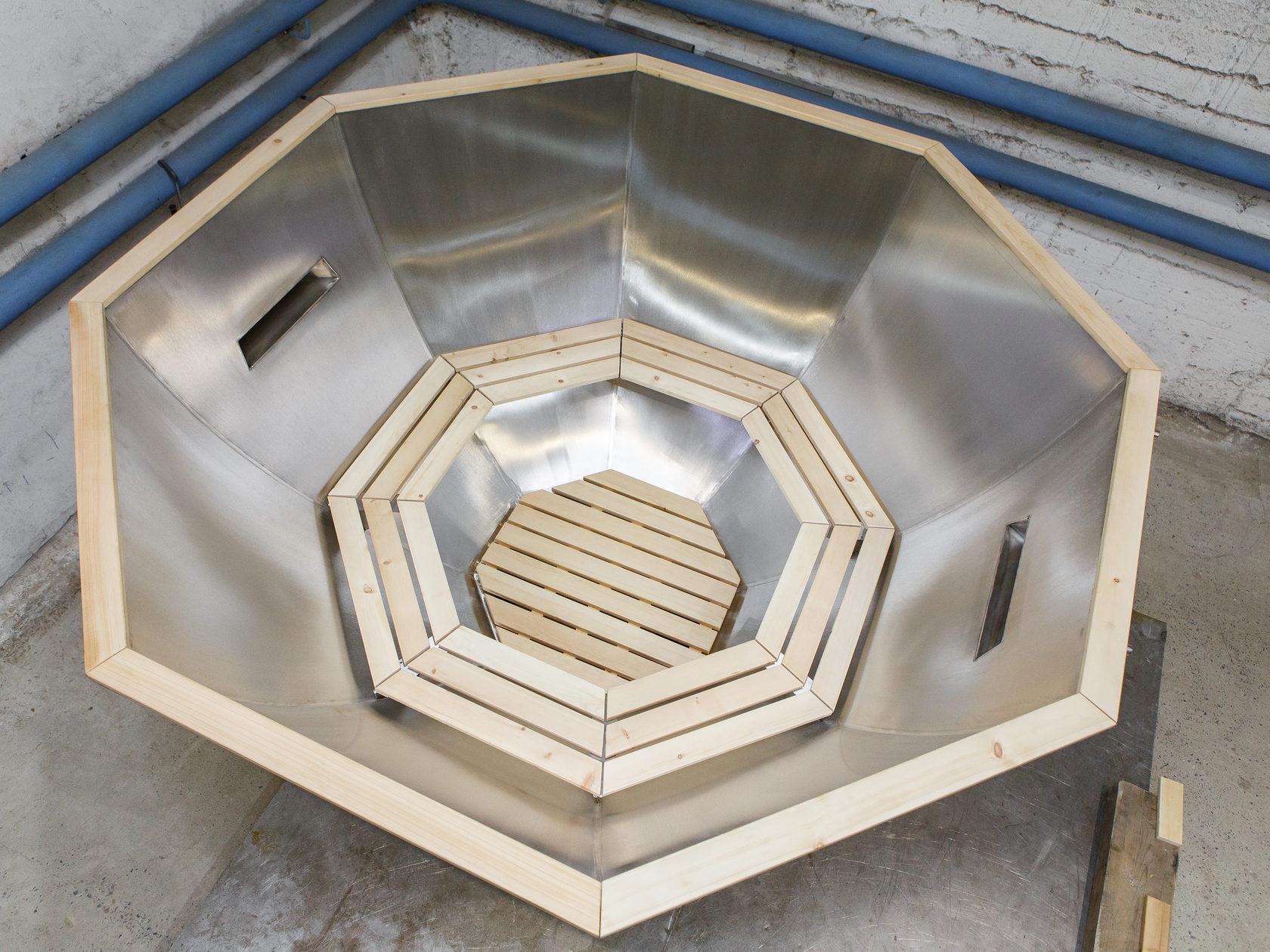 La cuve est retournée, la stabilité est vérifiée, et décorée.