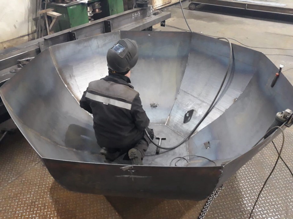- la structure est soudée en position renversée, d'abord un support est placé sous le polyèdre, il est soudé ;