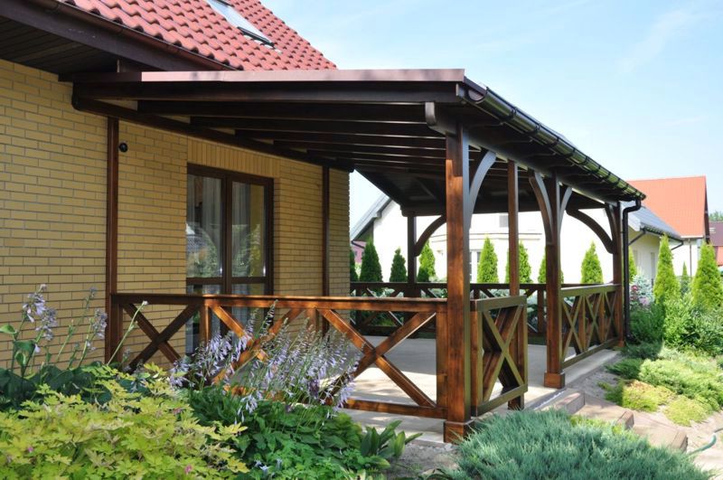 - Attaché. D'une part, le toit repose sur des supports, et d'autre part, il est fixé sur le mur d'une structure qui a une hauteur suffisante. La structure est facile à assembler, il vous suffit de creuser dans deux racks, les attaches sur la maison et d'installer le toit. La présence d'un appui fiable d'un côté permet d'abandonner le bétonnage des piliers.