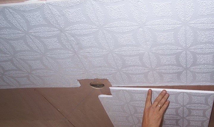 Une autre méthode rapide et relativement simple de finition des surfaces de plafond consiste à coller avec des carreaux de polystyrène expansé. Ils existent en différentes tailles, colorés ou blancs, avec ou sans motifs en relief. Ces tuiles se caractérisent par la facilité d'installation et de démontage, la résistance à l'humidité. Parmi les inconvénients :