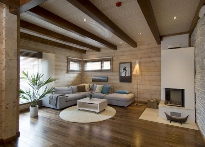 Si la décision est prise d'utiliser des poutres de plancher comme éléments décoratifs, la finition finale du plafond dans une maison privée est ourlée de l'intérieur à des éléments en bois spéciaux fixés sur les surfaces latérales du plafond.