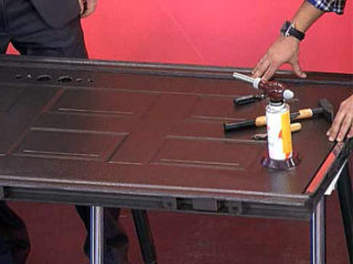 • Une fois la colle sèche, les raccords sont cousus et les trous pour la serrure et la poignée sont découpés. Des rouleaux isolants sont collés sur le rembourrage.