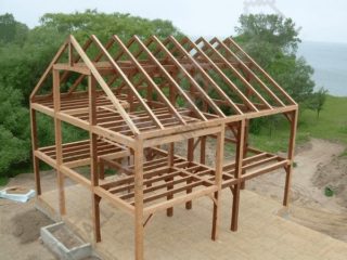 La conception est capable de résister à des charges élevées et permet l'installation de grandes ouvertures de fenêtres et de portes. La technologie est dite "allemande" ou à colombages. Le cadre est assemblé à partir de poutres ou de planches massives et de poutres de plancher. Pour le renforcement, des éléments verticaux et horizontaux complètent les flèches. Les détails de la structure sont fixés par la méthode d'insertion, pour augmenter la résistance, ils sont fixés avec des coins et des plaques métalliques. Dans la version classique, les murs sont remplis de paille et de blocs d'argile.