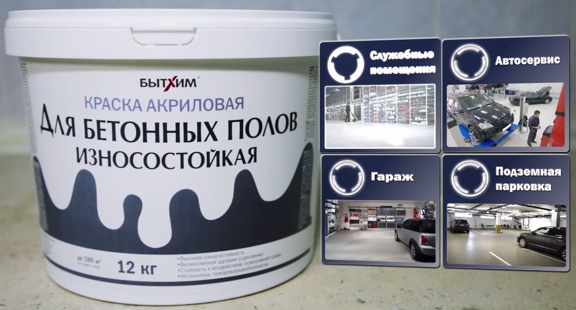 La peinture acrylique pour béton est à base de résines et de polymères. La composition crée une surface mate, semi-mate ou brillante. Le film protecteur rend le sol résistant aux influences chimiques et mécaniques, empêche la destruction de la couche supérieure de béton. La composition n'a pas d'odeur désagréable. Il peut être appliqué au rouleau, au pistolet ou au pinceau. Il sèche rapidement.