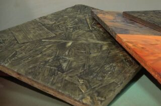 Les panneaux à copeaux orientés (OSB) ont été développés au Canada et sont largement utilisés dans la construction de maisons en Amérique du Nord. Le nom original du matériau est panneau à copeaux orientés (OSB). Il s'agit de plaques multicouches constituées de copeaux de conifères de grande taille pressés à haute pression et température. Les résines imperméables phénol-formaldéhyde sont utilisées comme liant. L'ajout de cire à la composition améliore les qualités imperméables. Les plaques peuvent être utilisées pour recouvrir les bâtiments de l'intérieur et de l'extérieur.