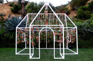 - Tuyaux en PVC. Une excellente solution lors de l'élaboration d'un projet est les conduites d'égout avec un joint à emboîtement. Il n'est pas difficile d'assembler et de démonter le cadre, la résistance est suffisante. La décoration (toit et murs) est réalisée en bâche colorée ou en toile PVC. Les détails sont dessinés et découpés.