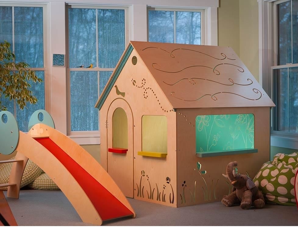 La disposition du projet et du produit est déterminée par l'endroit où le bâtiment est prévu pour être installé. S'il s'agit d'un appartement en ville, le coin le plus éloigné se démarque dans la pépinière. La structure elle-même est en contreplaqué dans une version réduite.