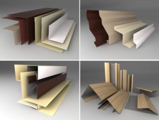 - Coins et vallées. Pièces d'angle conçues pour protéger les joints latéraux des rampes sur les toits en croupe. Subdivisé en modèles internes et externes.