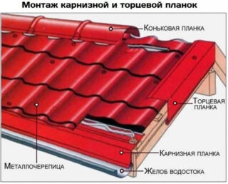 - Bandes de corniche. Ce coin pour tôle profilée est conçu pour protéger le surplomb de l'humidité, des débris, des insectes et des oiseaux sous le revêtement de sol. La fixation est effectuée sur le bord inférieur du lattage. Les produits peuvent être simples et bouclés. L'estampage supplémentaire a une fonction purement décorative.