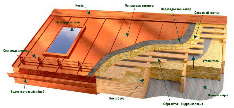 Dans la plupart des cas, le dispositif de toiture à joints ne diffère pas de la conception standard, qui sert de base à la construction d'immeubles résidentiels, commerciaux et de bureaux. Un système de chevrons, lattage, isolation et étanchéité sont en cours de réalisation. Une exception est la construction de chambres froides où il n'y a pas de couches isolantes. La différence fondamentale avec les structures en dalles est la disposition obligatoire d'une base dense et uniforme pour le revêtement. Cette condition est justifiée par le fait que lors du roulement, le matériau de toiture est soumis à de fortes charges verticales et qu'en l'absence d'une base solide, il ne sera pas possible de réaliser une connexion étanche. S'il n'y a pas de base sous l'acier, il s'affaissera avec le temps, ce qui perturbera la géométrie du toit et gâchera son apparence.