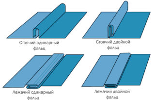 - Seul. Un simple pliage de toiles adjacentes autour d'un élément de fixation situé verticalement est effectué. C'est l'option la plus simple à fabriquer, mais peu fiable. Lors de la finition des cheminées, des fenêtres et d'autres objets de passage carrés, un nœud transversal est réalisé, dans lequel l'élément de crosse est plié près du métal. Une telle articulation unique est appelée couchée.