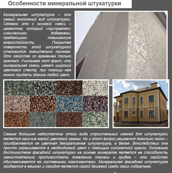 - Minéral. Le mélange est à base de ciment. Cela détermine la résistance élevée et le coût abordable du matériau. La plupart de la poudre est de couleur gris neutre. La décoration est réalisée en ajoutant des colorants et autres charges. Une autre option consiste à peindre la surface séchée avec des peintures de façade. La qualité du mortier est déterminée par la marque de ciment.