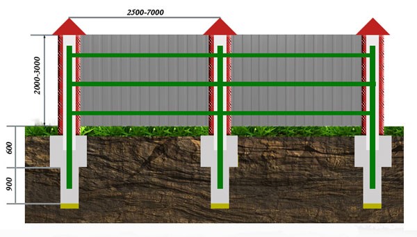 Lors du calcul de l'étape d'installation et de la taille du poteau, il est nécessaire de prendre en compte les poteaux de support installés aux angles du site et ceux qui encadrent les ouvertures des portails et des guichets. Dans le même temps, il est important de maintenir une distance constante entre les poteaux intermédiaires afin d'obtenir une répartition uniforme de la charge sur la fondation.