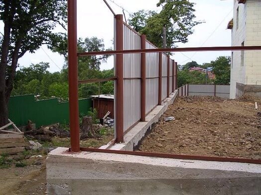 L'installation est difficile. Dans les cas simples, le martelage ou le support est utilisé. Mais si la clôture est au moins constituée d'une solide feuille de bois ou d'ardoise, ils ont recours à une méthode différente. Creusez un trou plus large pour le pilier jusqu'au bas du support en fer et soudez les tôles. Ensuite, la tranchée est coulée avec du béton ou du ciment.