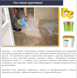 Le traitement avec un agent d'imprégnation renforce la base, lie les particules de poussière, améliore l'adhérence du composé de coulée à la surface. De ce fait, l'eau de la composition ne pénètre pas dans le matériau de chevauchement, le durcissement du mélange se produit sur un mode technologique. L'apprêt pour le sol sous le sol autonivelant est appliqué sur des supports denses ou meubles.