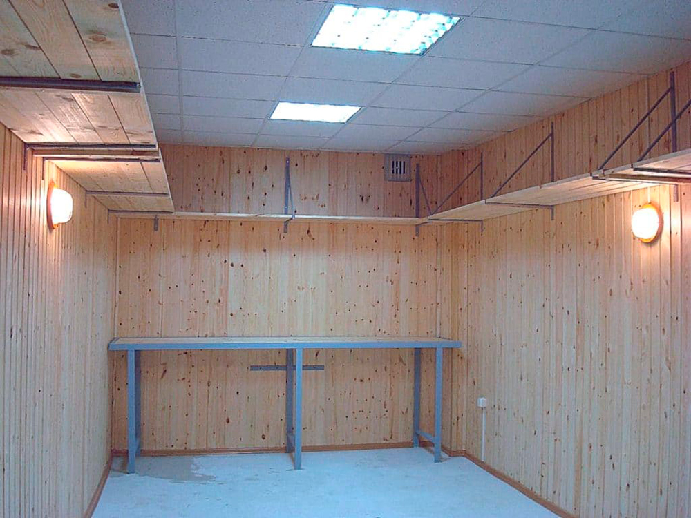 Un lieu de travail avec un établi est aménagé dans la partie la plus éclairée du garage ou de bonnes lampes sont installées. Le poêle est placé de manière à réchauffer au maximum l'espace, alors qu'il était impossible de se brûler.