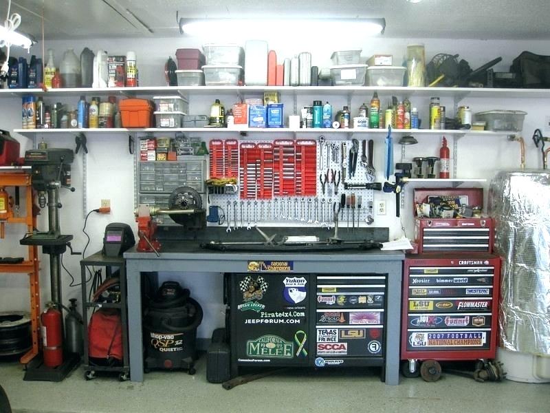 Le lieu de travail comprend un établi et des étagères pour les outils, la quincaillerie et les matériaux. Les étagères sont placées de manière à ce que le maître, lorsqu'il travaille, touche toutes les boîtes, coffres, filets et poches. Le propriétaire choisit des idées pour le garage et l'équipement à sa discrétion, mais se conforme aux exigences de sécurité.