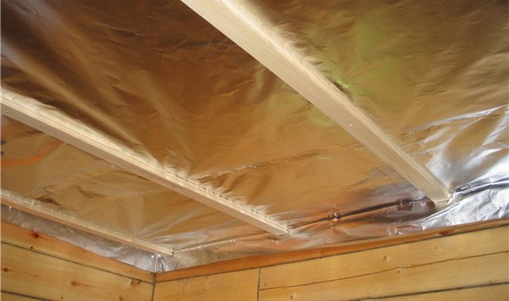 - Un film pare-vapeur est fixé aux poutres par le bas. Posez-le avec un chevauchement sur les murs jusqu'à 10 cm.Le long du périmètre, le matériau est fixé avec des barres de montage: elles assurent un ajustement parfait du film.