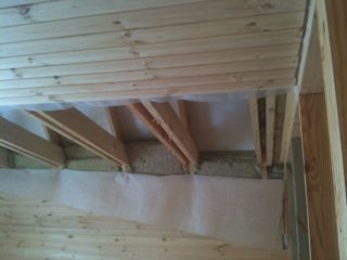 - L'isolation se fait par le grenier. Il y a suffisamment d'espace entre les bûches pour placer à la fois une couche d'argile expansée et un tapis de laine minérale. La hauteur de couche n'est que de 50 mm inférieure à la hauteur des poutres. L'entrefer assure la circulation de l'air.