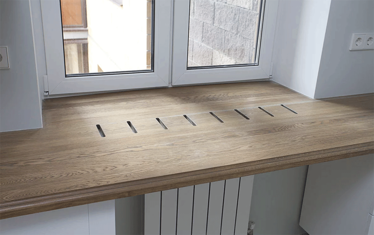 - Bois. C'est un classique, éprouvé au fil des siècles. Le matériau est respectueux de l'environnement, chaud au toucher et facile à traiter. Le rebord de la fenêtre en bois peut être verni, teinté ou peint à l'eau. Étant donné que le produit sera exposé au contact de l'eau, il vaut la peine de choisir des types de bois résistants à l'humidité. Vous pouvez économiser de l'argent si vous fabriquez un rebord de fenêtre à partir de lattes de vos propres mains. Les produits n'ont pas peur des changements d'humidité, ils ne seront jamais conduits.