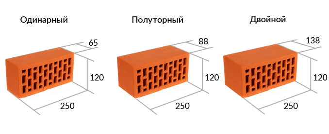 Les dimensions des variantes spéciales diffèrent. L'argile réfractaire Ш-5 a des dimensions de 230 * 114 * 65 mm, Ш-6 - 230 * 115 * 40 mm. Le clinker ou tout parement a une épaisseur minimale : 290 * 140 * 85 mm, 250 * 85 * 65 mm. Les parpaings, en revanche, sont beaucoup plus gros.