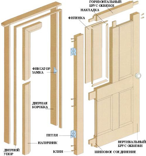 Bloc de porte - une structure qui comprend une boîte (cadre), un rideau, des dispositifs de verrouillage et des auvents (charnières). De plus, un limiteur d'angle d'ouverture et un judas sont installés.