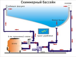 Cette méthode de nettoyage est bonne, tout d'abord, pour la facilité d'installation. Le propriétaire de la piscine n'a pas besoin d'installer un bac de trop-plein et un réservoir d'équilibre. Une unité moyenne traite 30-35 m² de surface d'eau. Le nombre de skimmers et leur disposition sont déterminés par la surface totale, ainsi que la capacité des produits.