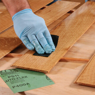 La première couche de vernis soulève le grain du bois, un ponçage intermédiaire est donc nécessaire pour préparer la surface à la deuxième application. Après finition, le bois est essuyé avec un chiffon humide pour enlever la poussière.