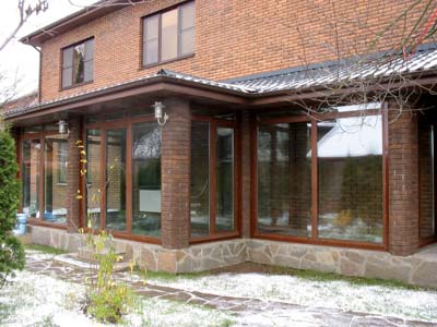 D'une manière différente, une véranda dans une maison privée est attachée, qui est protégée des intempéries de tous les côtés par des murs de 80 à 100 cm de haut.Le vitrage est constitué de feuilles simples transparentes d'une épaisseur de 3 à 4 mm. Les cadres sont en bois, en métal léger, des produits métal-plastique sont installés.