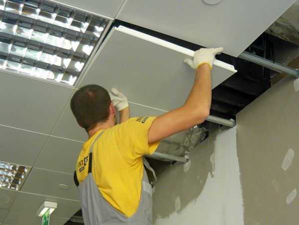 Le matériau de revêtement est monté. Il est préférable d'effectuer ce travail avec des gants, car les produits en panneaux ont généralement une certaine marque. L'air de la pièce ne doit pas être trop humide (moins de 70%). Commencez le travail à partir du milieu de l'avion. Le panneau est inséré en diagonale dans la niche, bord vers le haut, puis tourné horizontalement et abaissé sur la grille.Lorsque vous travaillez avec des produits à motifs, il est nécessaire de surveiller la disposition des éléments de motif. S'il s'avère que les panneaux sur les côtés du cadre ne rentrent pas dans les cellules de niche, ils devront être coupés. Les dispositifs d'éclairage sont montés de la même manière. Il est recommandé d'installer ces appareils à une fréquence telle qu'il y ait une lampe pour 6 mètres carrés de surface de plafond.