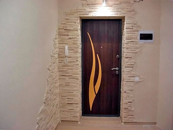 L'intérieur d'une porte d'entrée acquiert sophistication et individualité si la pierre décorative est utilisée pour son revêtement. L'épaisseur des plaques ne doit pas dépasser 4 mm, sinon la porte deviendra lourde et risque de se déformer avec le temps.