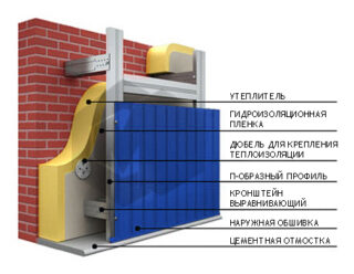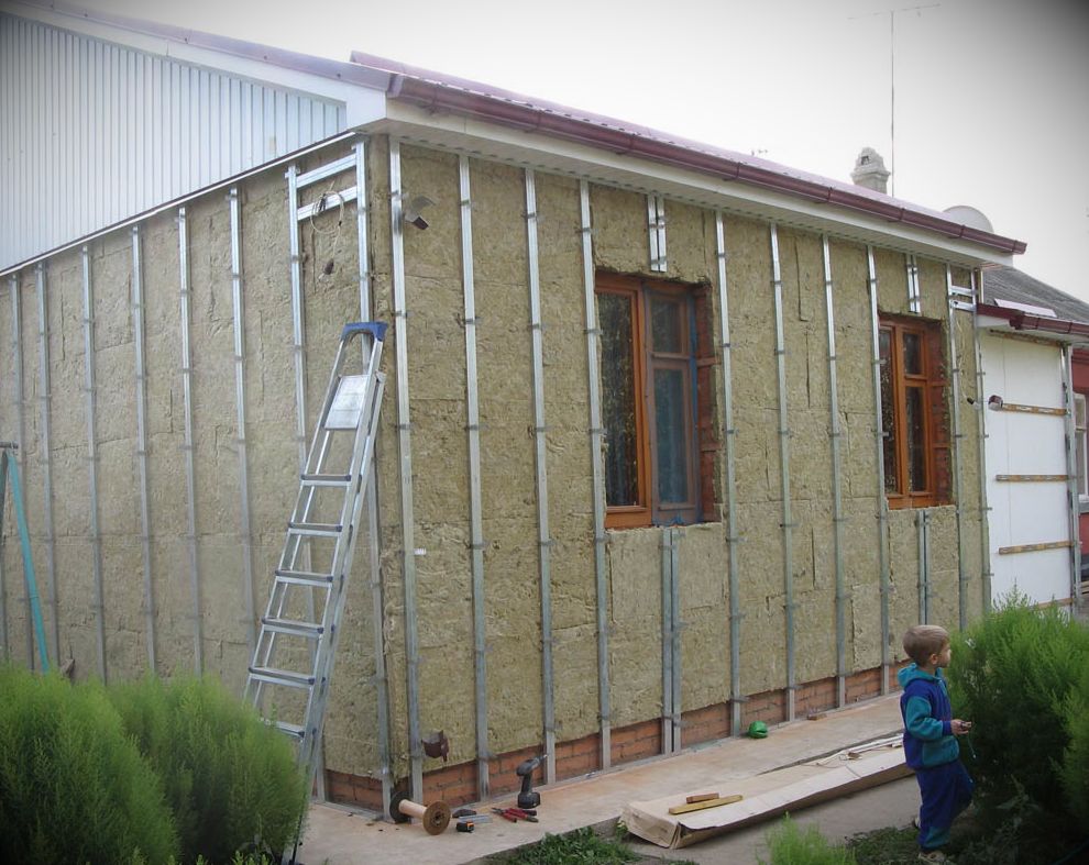 Des dalles de basalte rigides ou du polystyrène expansé sont utilisés comme isolant. Les isolants en laine minérale sont préférables, ils assurent la perméabilité à la vapeur des murs, ne brûlent pas, ne se déforment pas dans le temps. L'isolation thermique s'insère étroitement entre les guides. Pour la fixation, 5 chevilles à disque à tête large sont nécessaires - 4 sont installées sur les bords, 1 au centre. La mousse est fixée au mur avec une solution adhésive. Un film pare-vent et pare-vapeur est fixé sur l'isolant thermique. Les toiles sont posées avec un chevauchement de 10-20 mm, collées avec du ruban de construction. Le matériau protège l'isolant de l'humidité soufflée. Le film est fixé au cadre avec des vis autotaraudeuses.