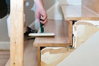 Ensuite, vous pouvez commencer à plaquer les marches avec du bois. Les éléments en bois ne doivent être collés que si la surface de l'escalier est entièrement recouverte de contreplaqué.