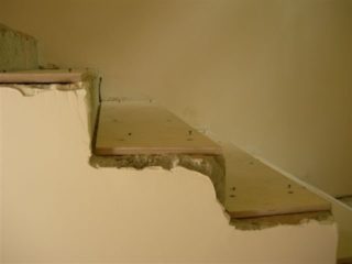 Tout d'abord, vous devez vérifier le niveau horizontal des marches de l'escalier. Les écarts doivent être minimes dans toutes les directions. Ensuite, à l'aide d'une scie sauteuse, vous devez préparer des panneaux de contreplaqué. Ensuite, les panneaux sont fixés aux goujons de contremarche, après quoi le contreplaqué est monté sur la bande de roulement. Après avoir posé tous les panneaux de contreplaqué sur du béton, une fausse corde est attachée à des clous liquides, qui peuvent être achetés ou fabriqués. Il s'agit d'un élément de support de l'escalier constitué d'un panneau mural, qui protège le mur de la saleté.