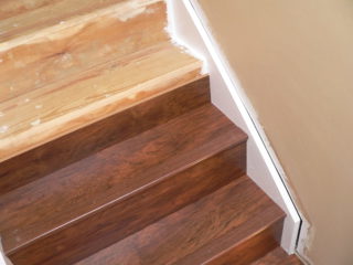 Pour un passage à chargement intensif, des stratifiés de classes 31, 32, 33, 34 avec une couche protectrice épaisse sont utilisés. La largeur de la bande de roulement est choisie de manière à correspondre à la taille de la lamelle et il n'est pas nécessaire de couper les planches dans le sens de la longueur, connectez-les sur les marches avec des serrures.