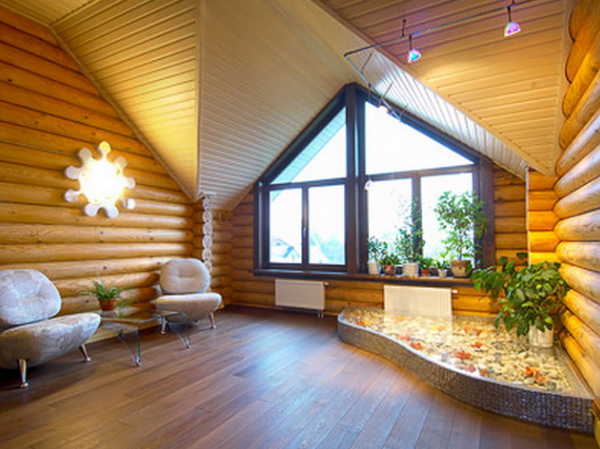 Le matériau est représenté par des barres de bois, qui créent un revêtement à l'imitation de bûches arrondies. C'est une sorte de doublure en euro et décore la pièce dans le style d'un intérieur rustique.