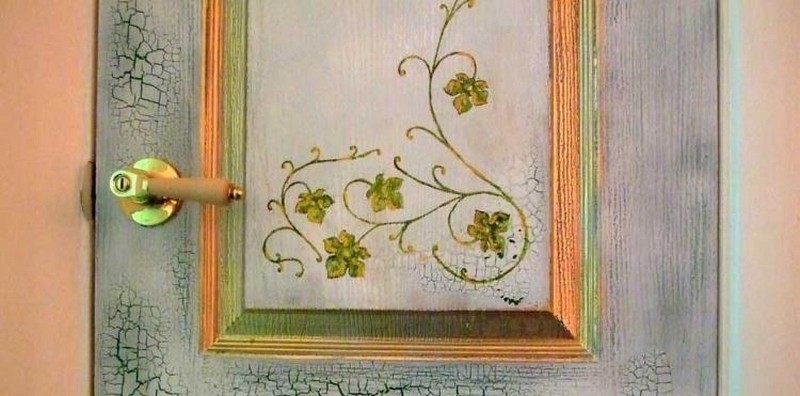 Cette option est bonne pour sa simplicité - pour sa mise en œuvre, il n'est même pas nécessaire de retirer la toile des charnières (s'il n'y a pas d'ancienne finition à démonter dessus). La surface est prélavée, séchée et apprêtée. L'ouverture est collée avec du ruban adhésif. La carte de découpage est trempée dans l'eau plusieurs minutes à l'avance (la durée est indiquée sur l'emballage). Ensuite, l'excès d'eau et les bandes de protection en sont retirés. L'ornement est appliqué sur la toile sur laquelle la colle PVA est appliquée. La surface doit être nivelée et les bulles d'air éliminées. Lorsque tout est complètement sec, vous pouvez vernir la porte avec de l'acrylique.