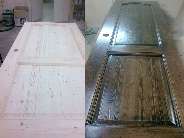 Pour la restauration de portes en bois massif, la teinture est bien adaptée. Il met bien en valeur la texture de la matière. En vente, vous pouvez trouver des compositions qui imitent des espèces d'arbres précieuses.