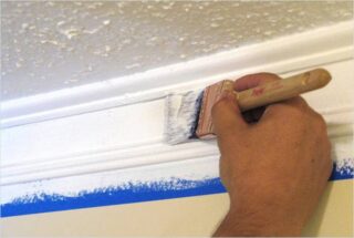 - Immédiatement le plafond et la plinthe. Ceci est fait lorsque les deux objets sont peints dans le même schéma de couleurs. Tout d'abord, le profil est fixé, les fissures sont recouvertes, puis le traitement général est effectué. Si le mur est déjà encadré, un large ruban de masquage y est collé.