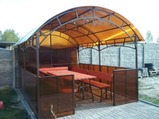 Si la structure est en métal forgé, les parois latérales n'ont pas besoin d'être recouvertes. S'il est nécessaire de protéger le gazebo du souffle, des bandes de polycarbonate et de bois sont fixées autour du périmètre.