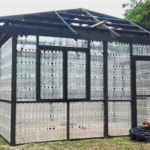 - À partir de contenants en plastique. Des bouteilles de différentes tailles sont utilisées, vous pouvez donc créer une certaine texture et un certain ornement sur des surfaces verticales. Un tel matériau ne se décompose pas avant deux cents ans. Par conséquent, la durabilité du gazebo dépend de la qualité du mortier et de la maçonnerie.