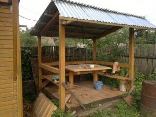 - Palettes. Les produits peuvent être utilisés assemblés pour la base, le revêtement et les racks peuvent être fabriqués à partir d'une barre. Les palettes sont également utilisées pour fabriquer des meubles pour le gazebo. Le plus souvent, les palettes sont démontées et des planches individuelles sont utilisées comme revêtement de sol, murs et toit impromptu. Après l'installation, ils sont peints avec de la teinture à bois et vernis.