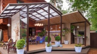 Si l'extension est un ajout décoratif au bâtiment, la meilleure option pour couvrir le gazebo intégré dans une maison de campagne est le polycarbonate. Il s'agit d'un plastique transparent, extrêmement durable, flexible et capable de retenir la chaleur.