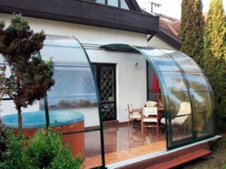 - Hi-tech assume une forme inhabituelle arrondie. Le gazebo est souvent construit avec un cadre en métal, gainé de polycarbonate, ce matériau est donc plus flexible. L'extension est vitrée au maximum et donne l'impression d'être transparente. Les rideaux sont exclus ici.