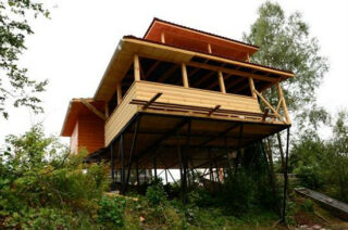 - les tuiles en bois, particulièrement complétées par une corniche sculptée, soulignent le style ethnique du bâtiment;
