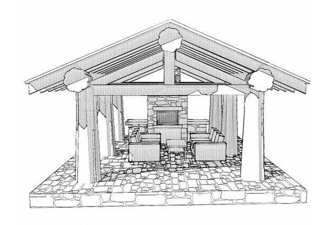 Vous pouvez également faire un gazebo en bois. Dans ce cas, le foyer est équipé à l'extérieur et les lieux de contact avec celui-ci doivent être isolés avec de la tôle. Tous les matériaux de construction en bois sont traités avec des imprégnations ignifuges.