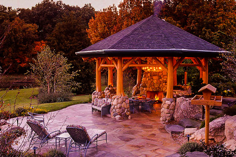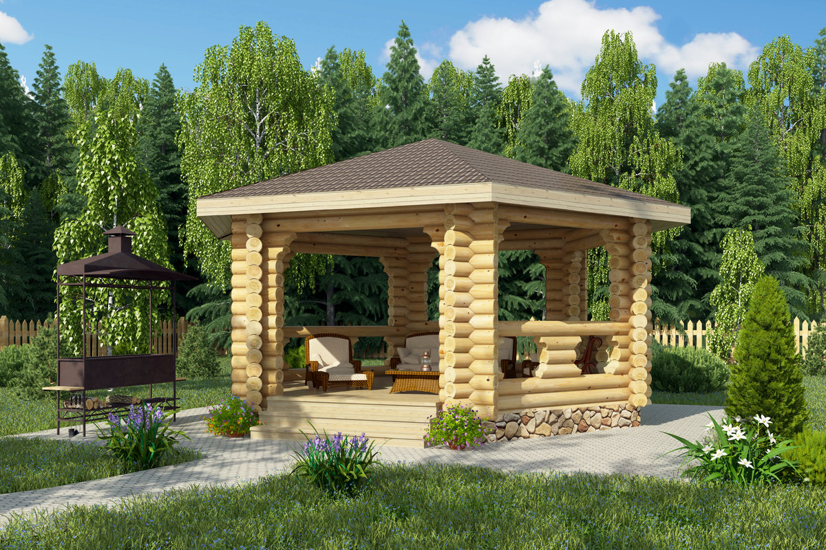 - Bois. L'assemblage est réalisé à partir d'une planche, de poteaux, de poutres en bois, de rondins et de bûches sauvages. Un gazebo pour une résidence d'été en bois a fière allure dans le contexte d'une forêt, d'une pelouse, d'un jardin et d'un potager.