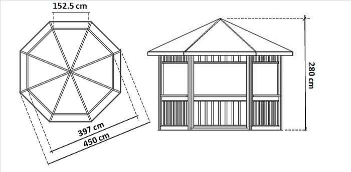 - Polygonal. La tonnelle peut avoir de cinq à huit côtés. Ces formes complexes ont fière allure. Dans la plupart des cas, ils sont équipés de vitrages panoramiques et de toits transparents.